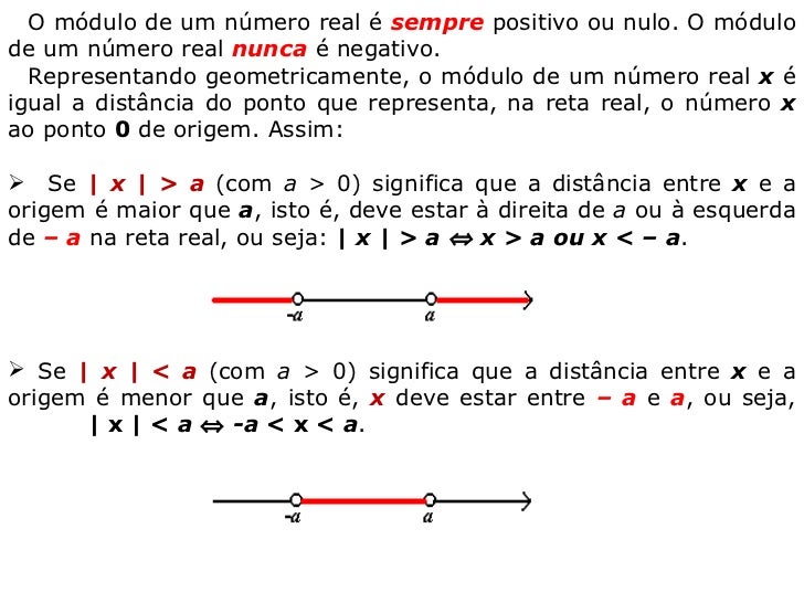 Observe que, como módulo é distância, o módulo de um número é sempre positivo. Só é verdadeiro se x ³ 0. Se tivermos x<0, não podemos afirmar que. Observe que, como módulo é distância, o módulo de um número é sempre positivo.